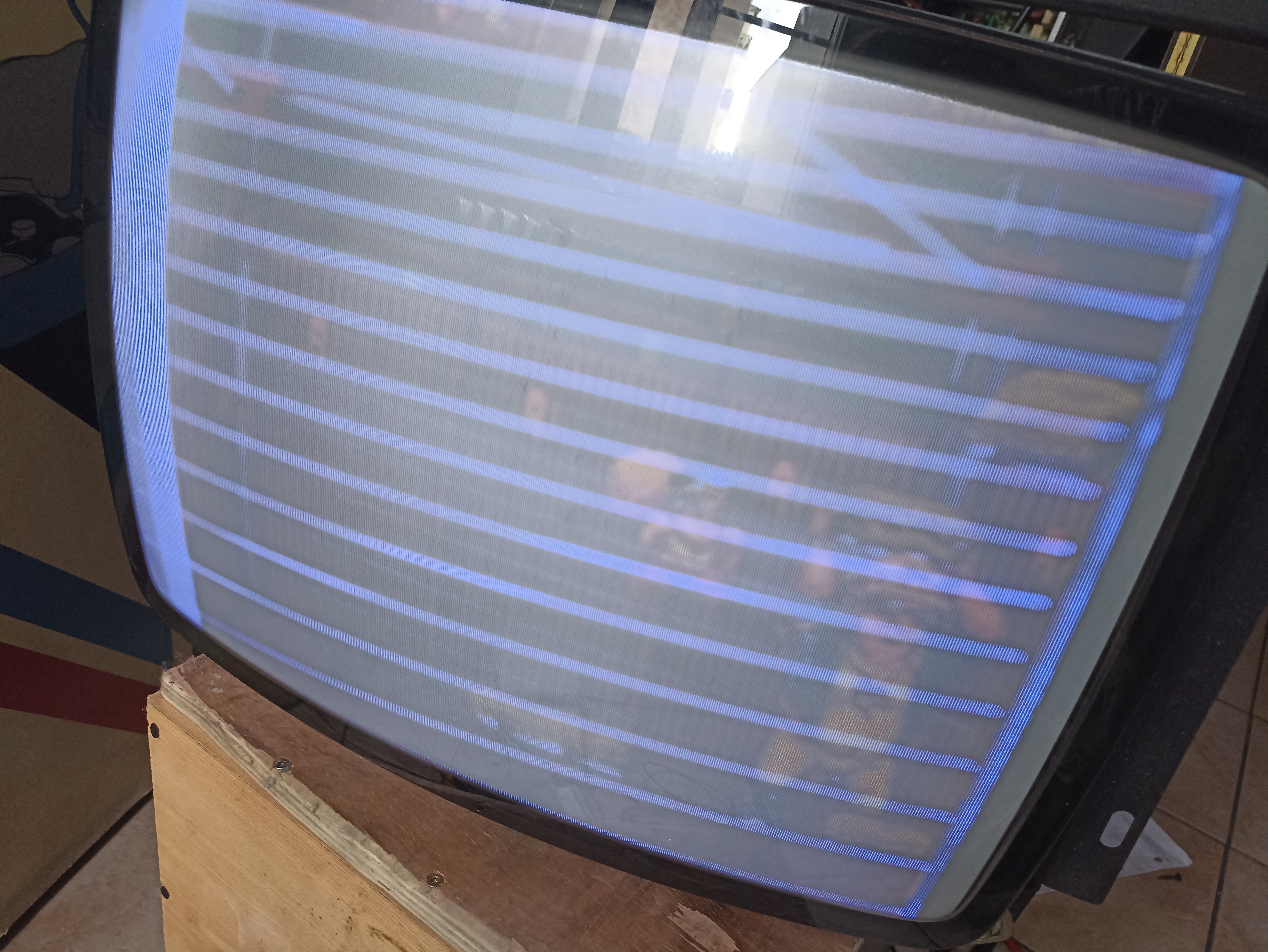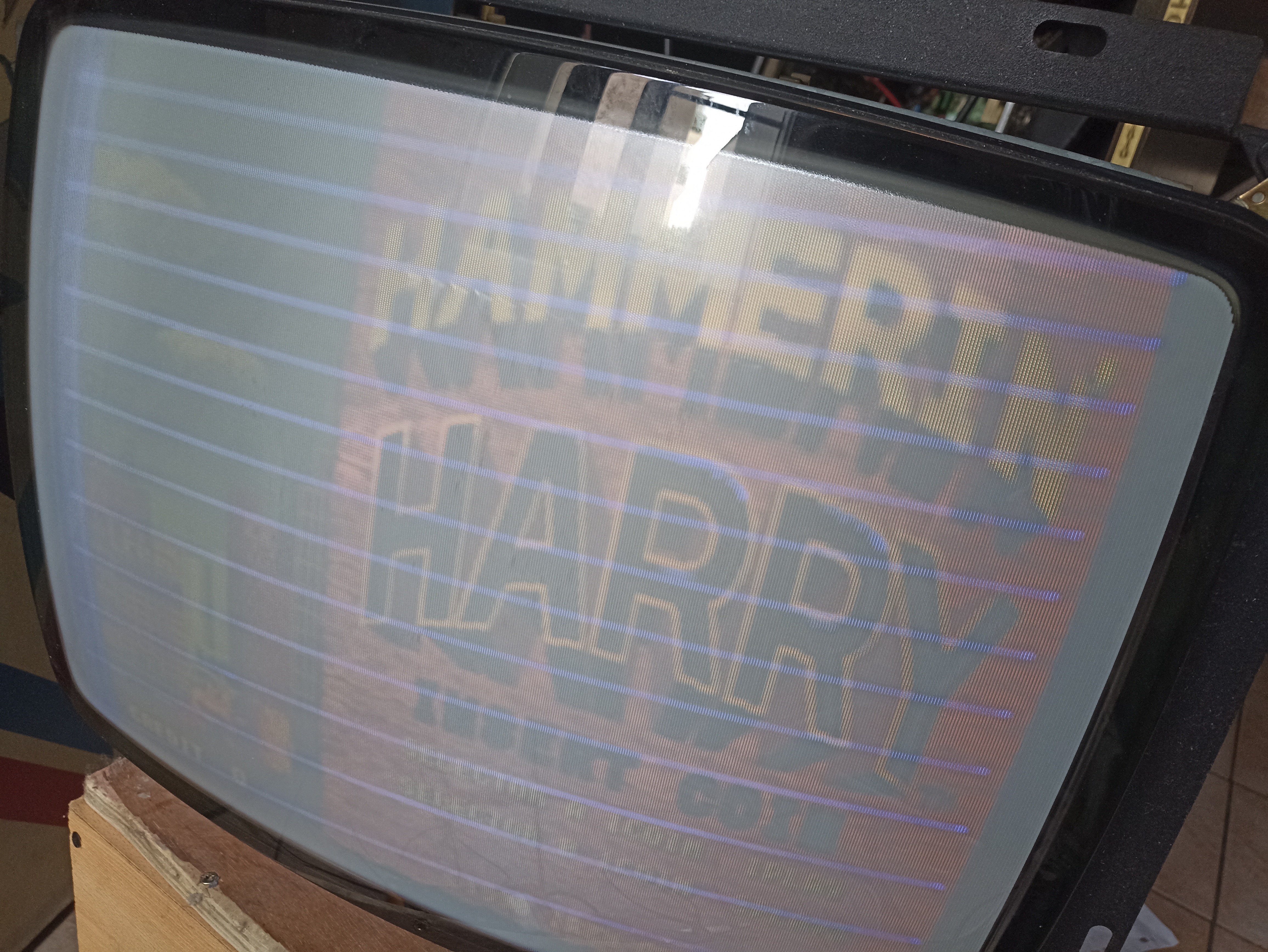 L'image apparait enfin, mais la synchro est à l'ouest. Je tripote la fréquence horizontale, un grand moment de plaisir seul et sans miroir, sans succès. Je tente ma chance avec la fréquence verticale et là l'image se verrouille. Et j'ai poussé un rire nerveux: ):))s=