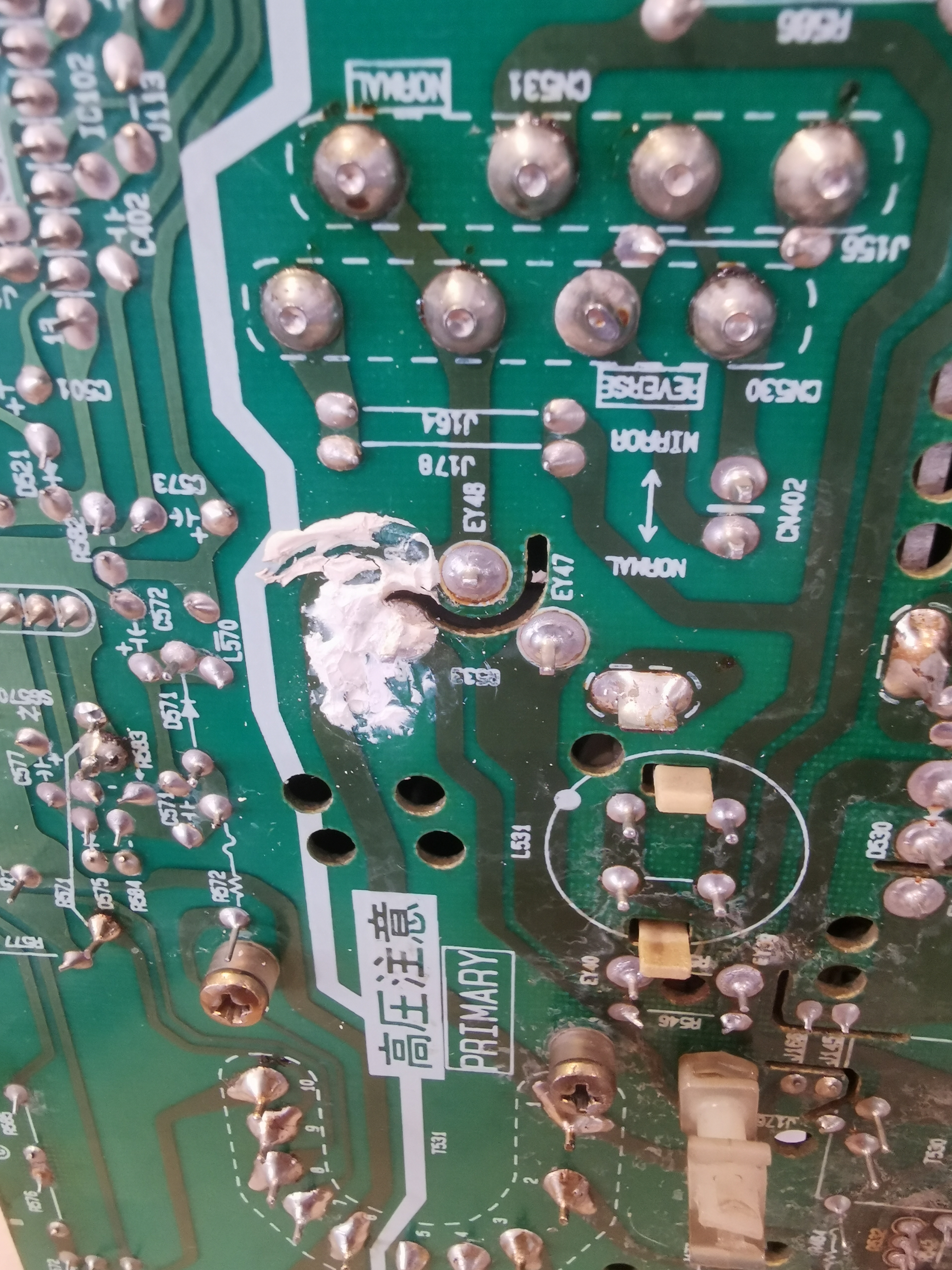 Arrivé à la maison, je démonte la bête. Je teste l'alimentation : 115V en alternatif, Ok. J'accède à la platine : elle ne semble pas avoir été capkitée (plots de colle présents). Je vois un peu de corrosion sur la gaine des pattes de R913 mais ça ne me choque pas. En revanche, je remarque que le fusible F901 est grillé : cool, j'ai une piste. Je le remplace, remonte le tout et remets sous tension. F901 grille illico.