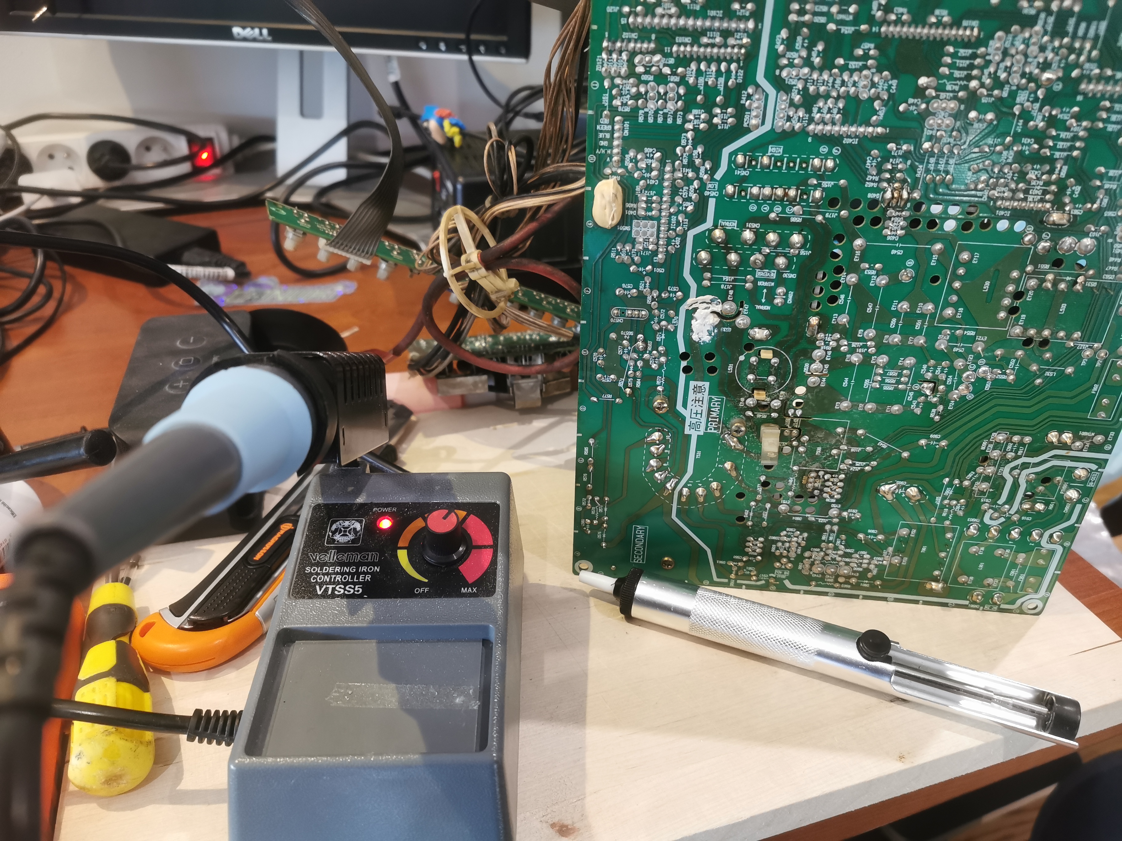 En attendant, je fais chauffer le fer et je prépare la pompe à dessouder.