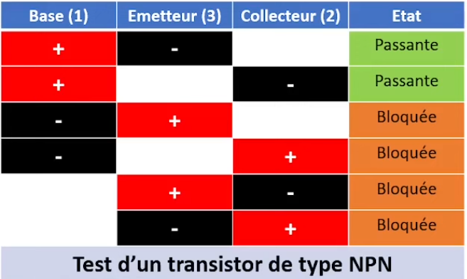Il ne devrait pas y avoir de continuité lorsqu'on met le négatif sur la base (patte du milieu) et le positif sur le collecteur ou l'émetteur.