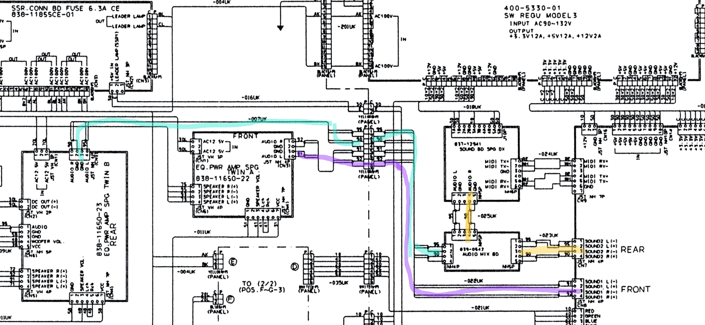 La sortie "Rear" (CN7) du stack va quant à elle à la mix board dont tu parles. Son volume y est réduit par les résistances qui y sont présentes si je ne m'abuse, et cette voie y est combinée  à la sortie de la Soundboard qui gère les musiques (en jaune).