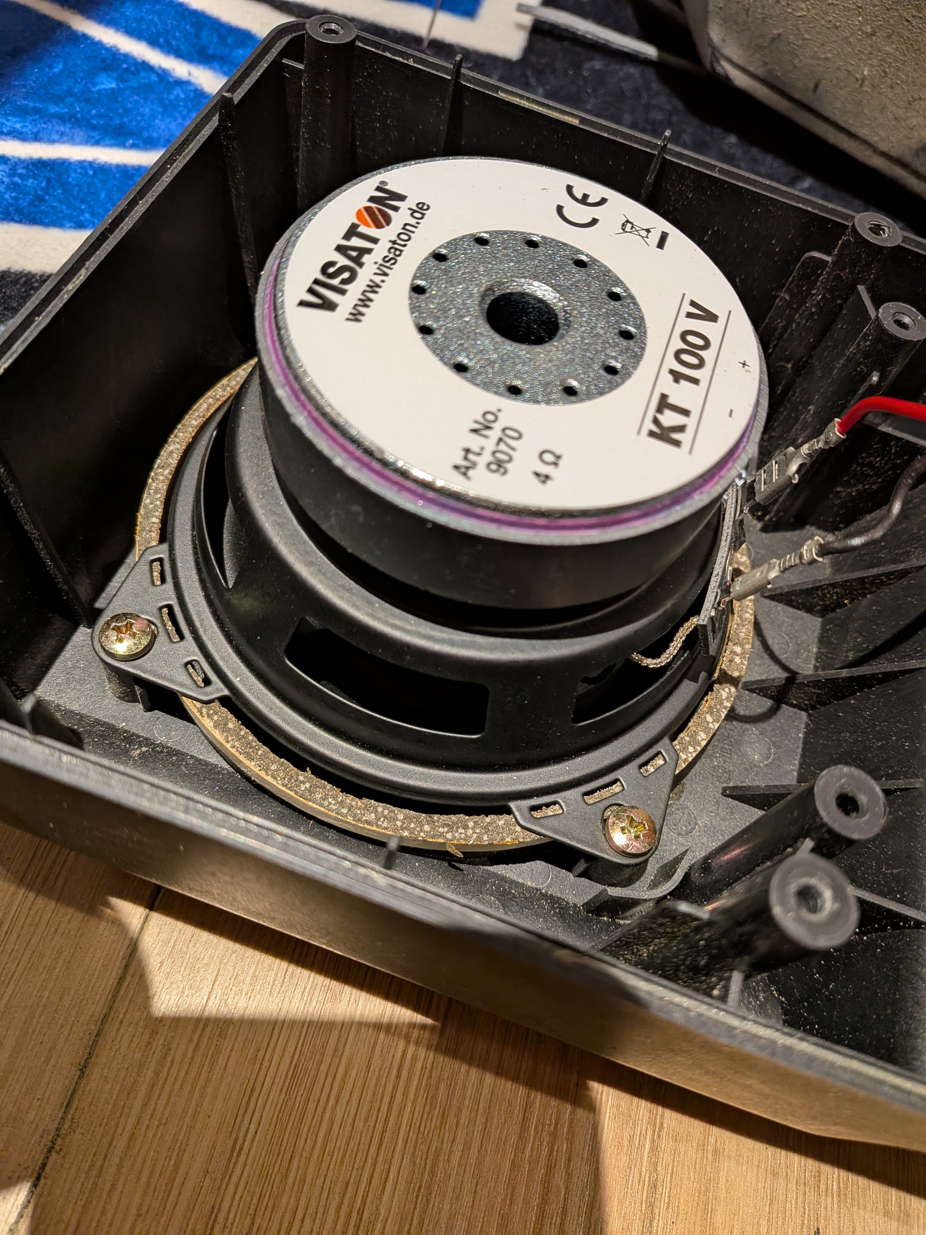 Premier test avec un boomer visaton KT100V choppé à vil prix. 7€ en promo sur un site dernier exemplaire en destockage. Ça sera probablement la seule bonne affaire de ce fil  :laugh:  . 4ohms, 25W et surtout un format qui permet de le fixer sans modification.