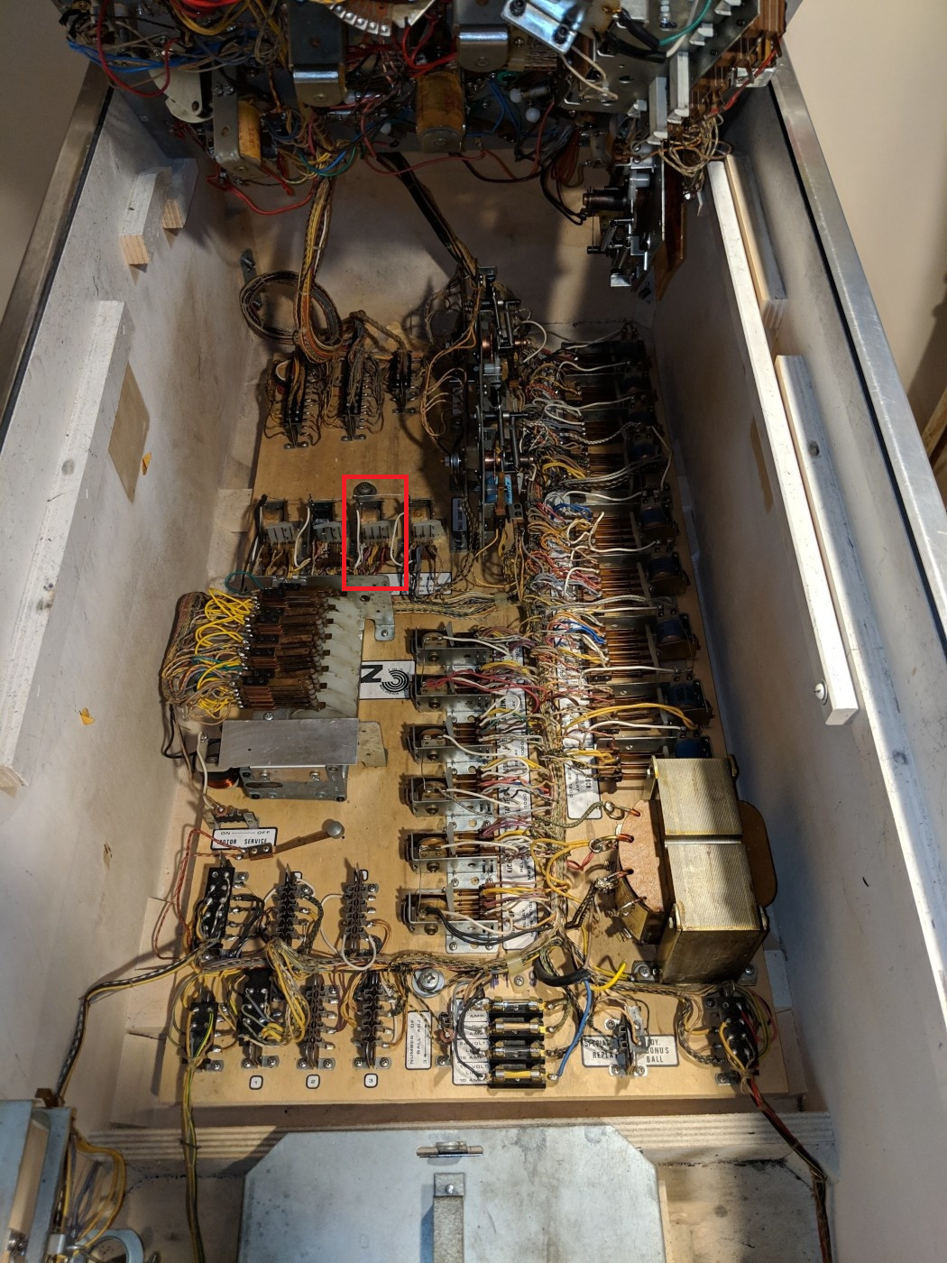 j'appuie sur le plastique blanc qui tient les lamelles cuivre (ben oui ça chatouille un zaccaria EM je crois que c'est du 50 v alternatif) et enclenche le "bonus relay" manuellement :